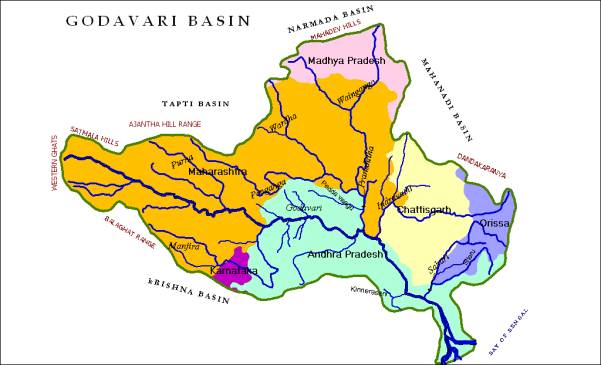 The Godavari basin is bounded on the North by the Satmala Hills, the Ajanta Range and the Mahadeo Hills, on the South and East by the Eastern Ghats and on the West by the Western Ghats. It is roughly triangular in shape and the main river itself runs practically along the base of the triangle.