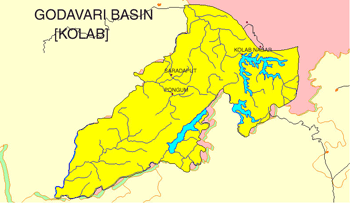 The Kolab rises near Sinkaram hill on the 3000 foot plateau, flows north-west in a winding bend, passing five miles to the south of Koraput and falls down to the 2000 foot plateau not far south of Jeypore. At the end of its descent to the Jeypore plateau the river is spanned by a fine bridge near Kotta. It flows right across the Jeypore tahsil in a north-westerly direction for 20 to 30 miles and then suddenly doubles back and runs nearly south, forming the boundary between Koraput and Bastar. It then runs south back into this district forming, for a few miles, the boundary between the Nowrangpur and Malkanagiri subdivisions passing at this point through a gorge in the will hills west of Ramagiri, which are called Tulisi Dongar range. As it issues from this it falls about 49 feet into a large pool, 12 or 14 feet deep, into which in days gone by, as tradition goes, witches used to be thrown with a stone round their neck. Turning west again, and passing Salimi, the river flows into Bastar, past Sukuma, and at last again divides Bastar from Koraput, forming the western boundary of Malkanagiri subdivision for many miles. In this last part of its course, it is called the Sabari. At Motu the extreme south-western corner of the subdivision it meets the Sileru, and the two pass out of Orissa into Andhra Pradesh and fall eventually into the Godavari river. The total length of the Kolab and Sabari is 280 miles, of which all but 55 miles flow through Koraput district or along its boundary.